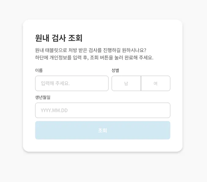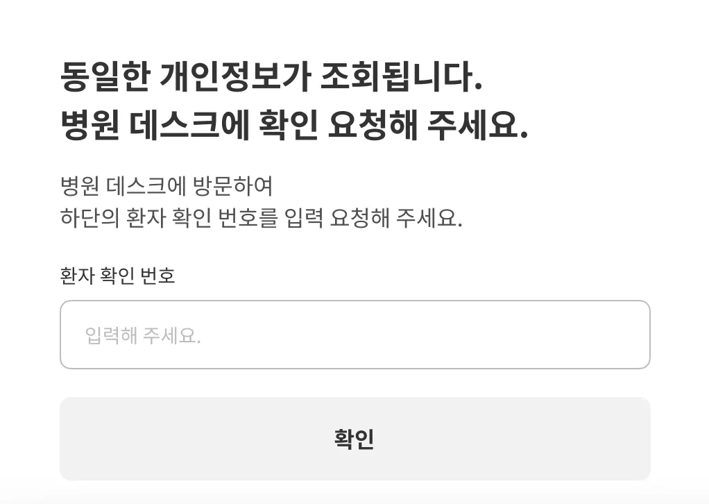 원내 검사 조회 결과 이름, 성별, 생년월일이 동일한 환자가 2명 이상 확인되는 경우, 환자 확인 번호를 요청하는 화면이 나옵니다. 환자가 해당 화면으로 데스크에 문의 주시는 경우, 메트리에 등록하신 환자 번호를 입력해 주세요.