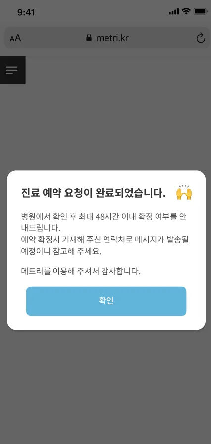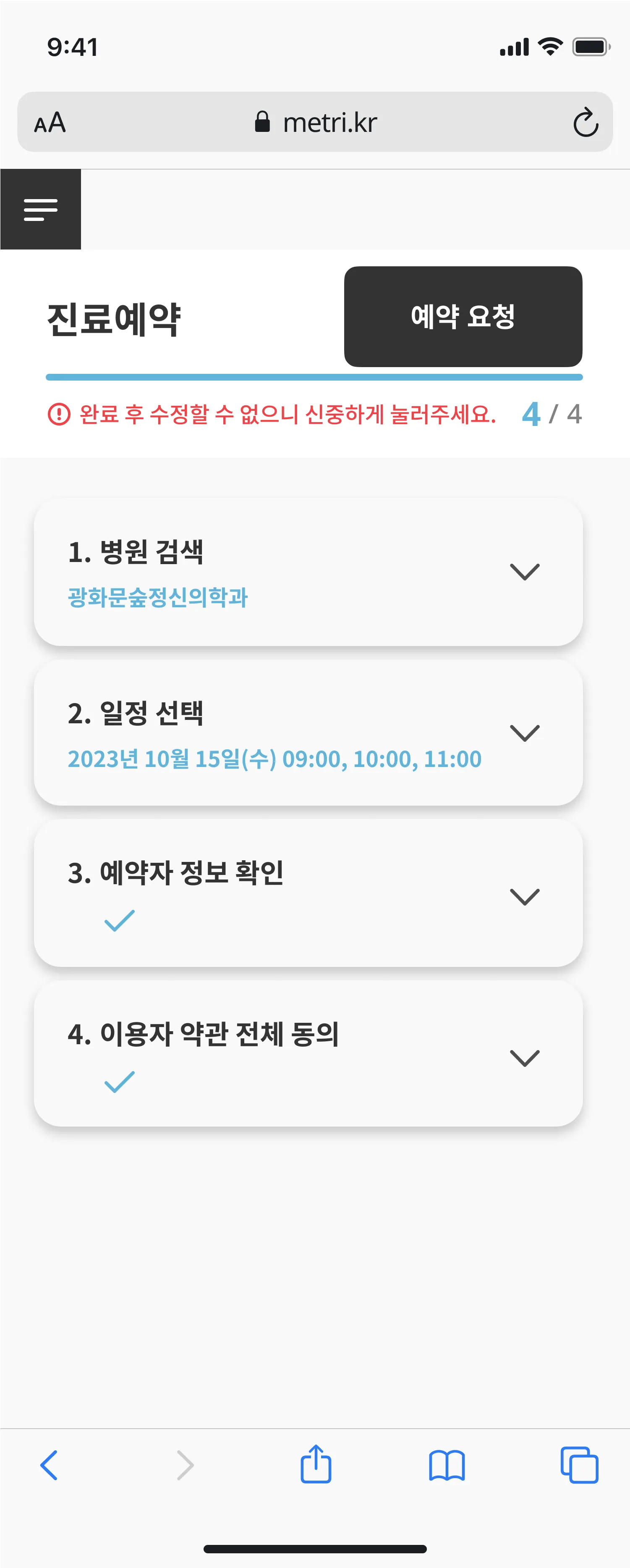 4개 질문에 답을 완료하면, 상단의 ‘예약요청’ 버튼이 활성화 됩니다. 버튼을 눌러 병원에 예약 요청을 완료해 주세요. 병원에서 최대 영업일 기준 48시간 이내 확정 여부를 안내 드릴 예정입니다.