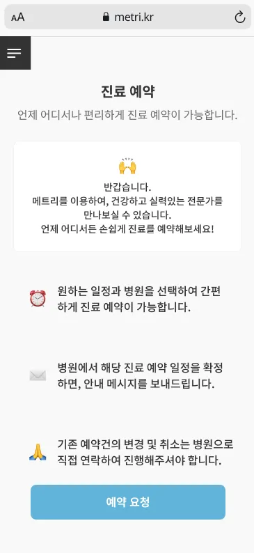 로그인 후, ‘진료 예약’ 메뉴를 선택해 주세요. 내용을 확인 후 ‘예약 요청’ 버튼을 눌러 주세요.