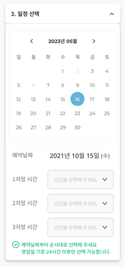 일정 선택 : 예약날짜부터 순서대로 원하는 예약일정을 1~3지망까지 선택해 주세요.