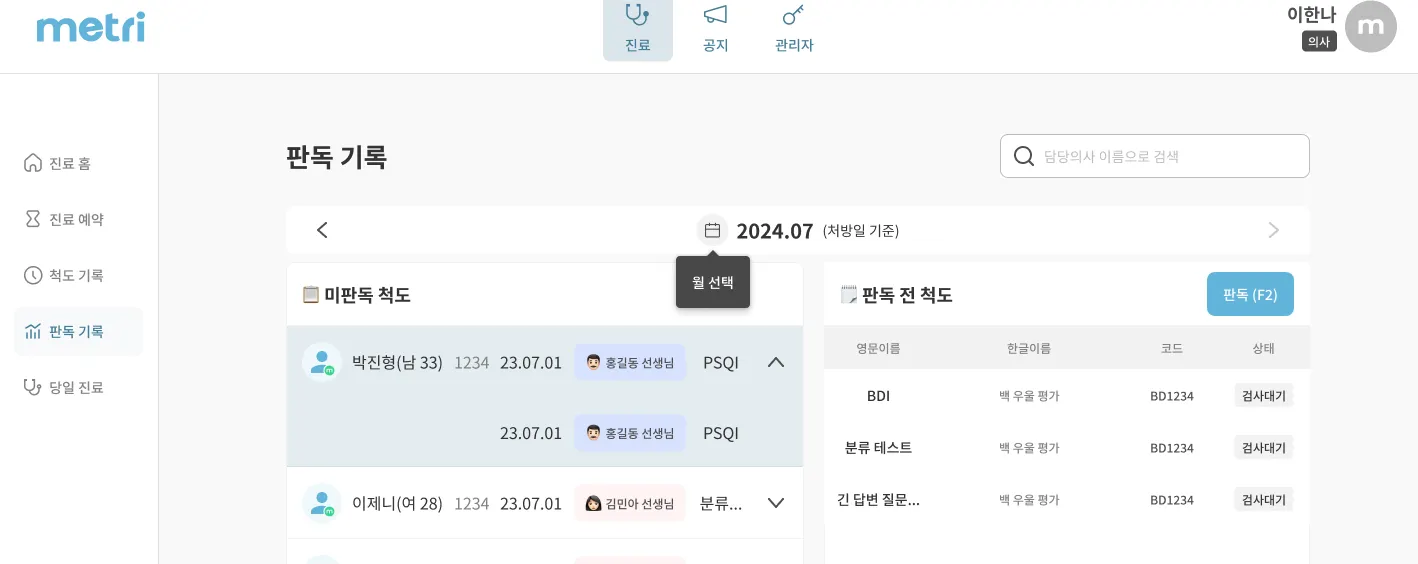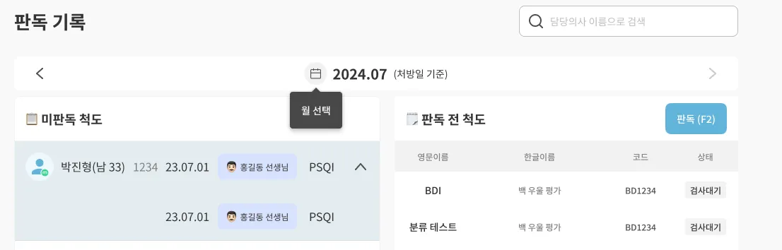 환자에게 처방후 환자가 검사완료하였으나, 판독되지 않은 척도를 모아보고 판독 처리할 수 있습니다.
