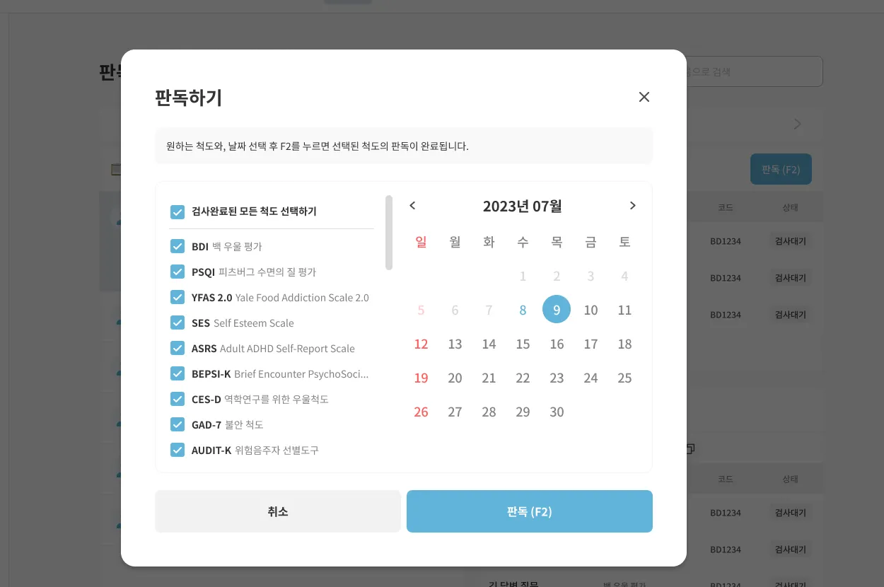 우측 화면에서 ’판독’버튼을 눌러 검사완료된 척도를 판독 진행하실 수 있습니다.