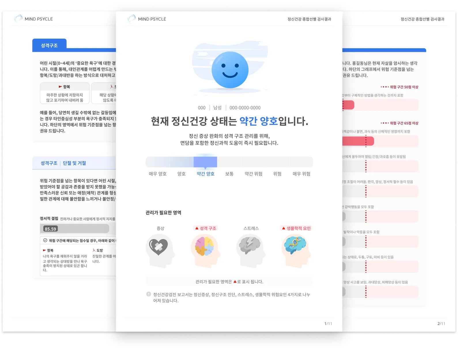 불안, 우울, 공황과 같은 여러 정신 증상 및 스트레스 정도를 보며 현재 자신에게 어떤 정신적 고통이 얼만큼 나타나는 지 알 수 있고, 자신과 세상을 바라보는 관점인 스키마(성격구조) 분석을 통해 정신적 고통이 나타나는 원인에 대해 보다 심층적으로 이해할 수 있답니다.