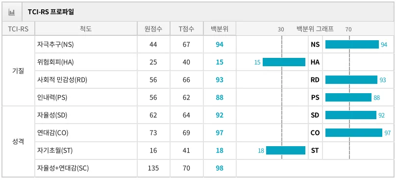 TCI 검사는 개인이 태어날 때부터 가지고 있는 기질과 성장하면서 형성해온 성격을 구분해 측정하여 개인을 이해하는데에 목적을 둔 검사에요.