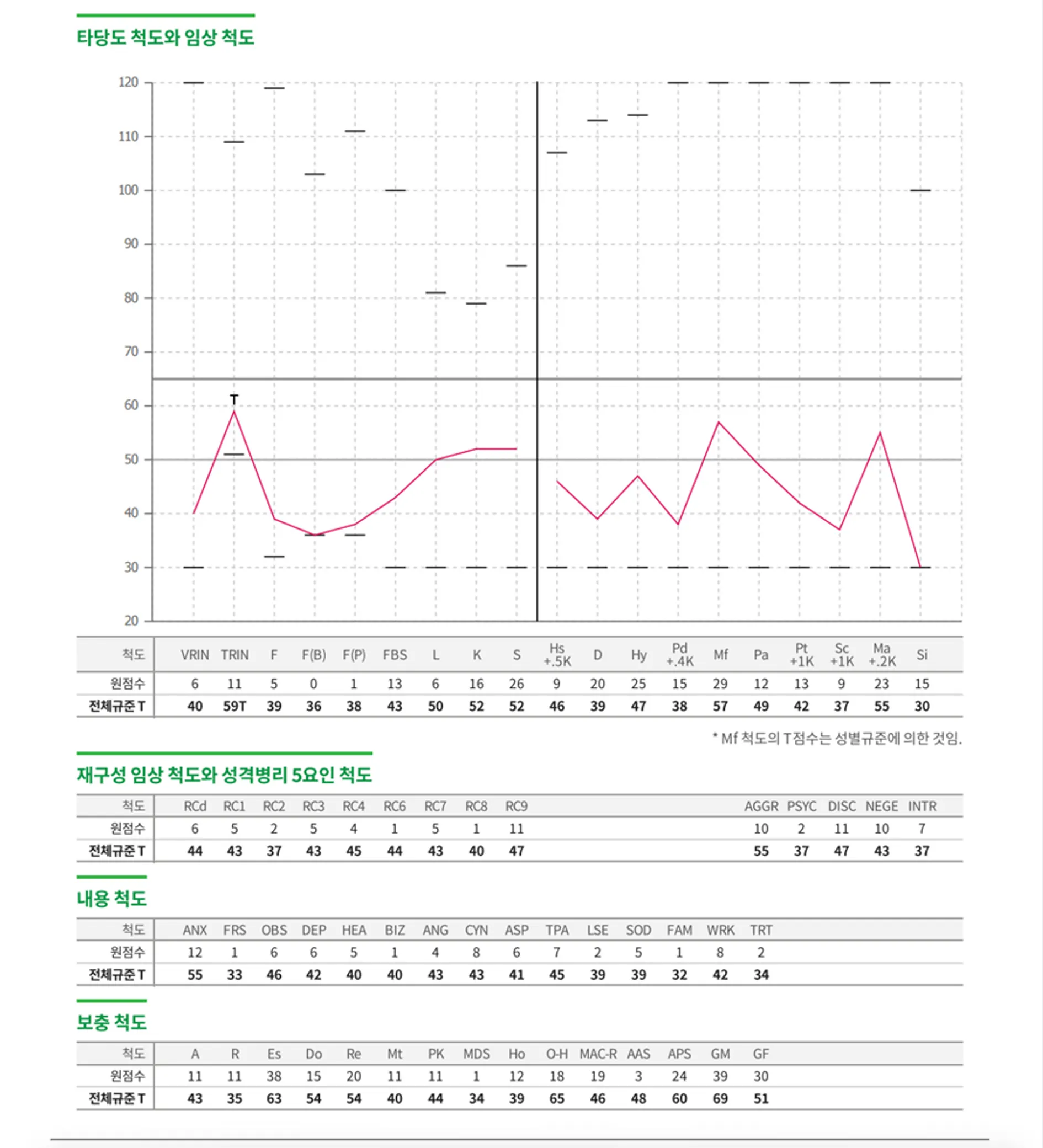우울증, 히스테리, 경조증, 반사회성, 남성(여성)특성, 편집증, 강박증, 정신분열증, 사회적 내향성 등의 10가지 척도를 평가하여 개인이 지니고 있는 심리적 특성의 정보인 성격, 정서, 그리고 적응 수준을 객관적으로 확인할 수 있어요.