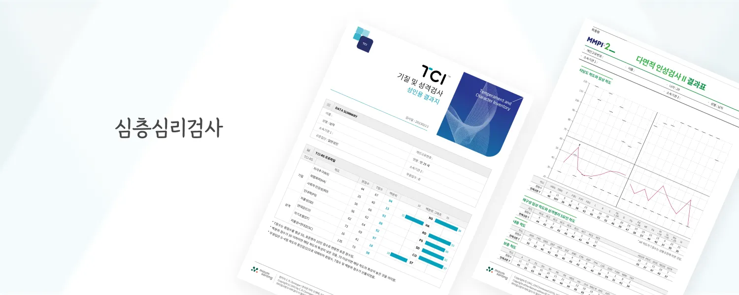 심층심리검사는 나의 성격과 기질, 현재 심리 상태에 대해 자세하게 살펴볼 수 있는 검사로 MMPI, TCI, SCT 총 3가지 검사로 구성되어 있어요.
