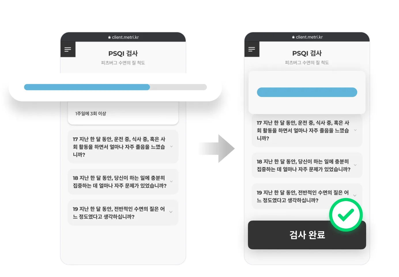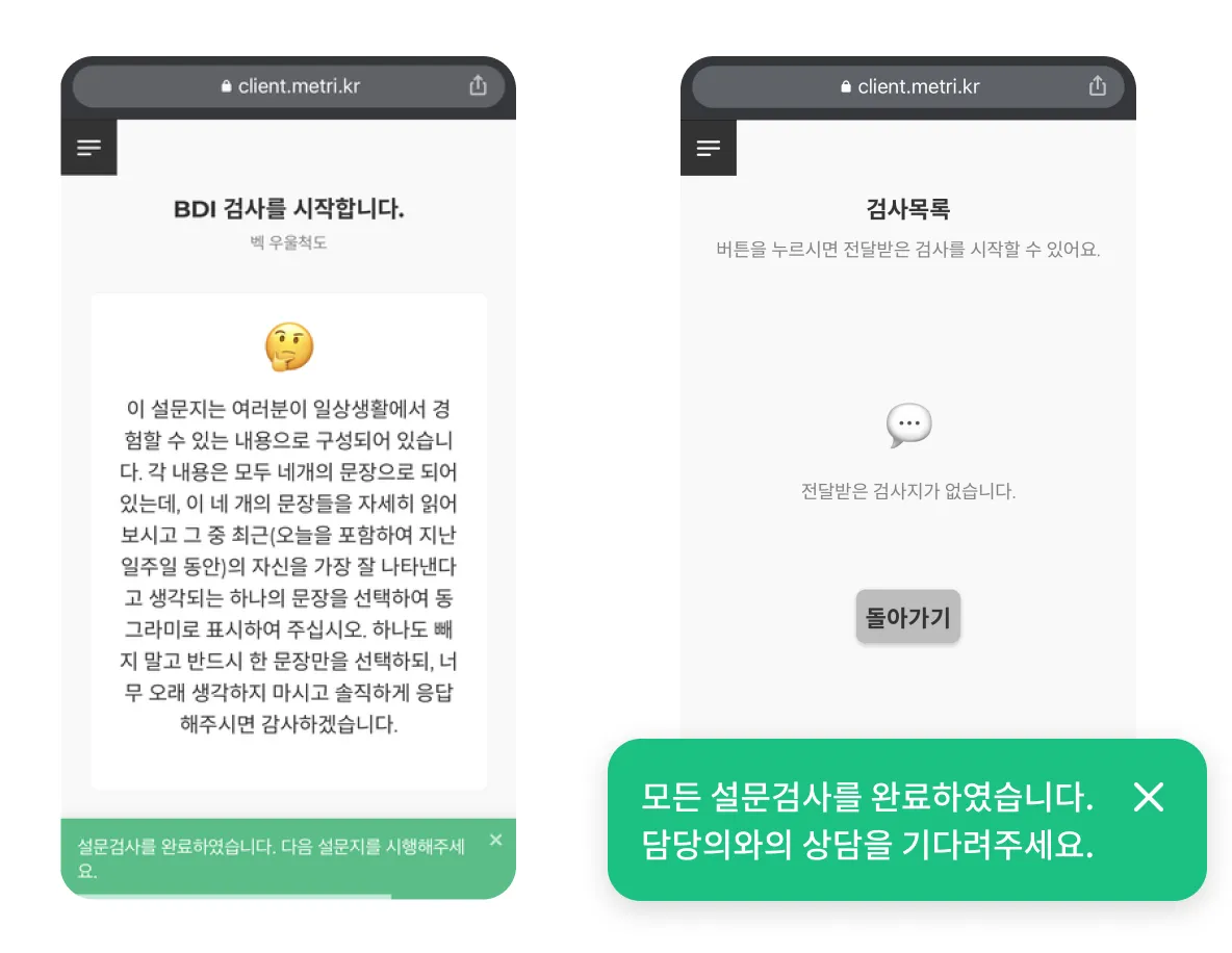 3) 만약 미시행 척도가 있다면, 검사 완료후 새로운 척도를 바로 이어서 검사 진행하실 수 있습니다. 처방받은 검사지를 모두 완료하면 안내 메시지가 나타납니다.