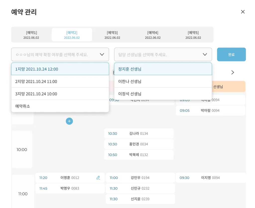 2) 환자의 예약요청 일정과, 해당 날짜의 선생님들의 시간표를 확인하여 예약을 확정 혹은 취소해 주세요.