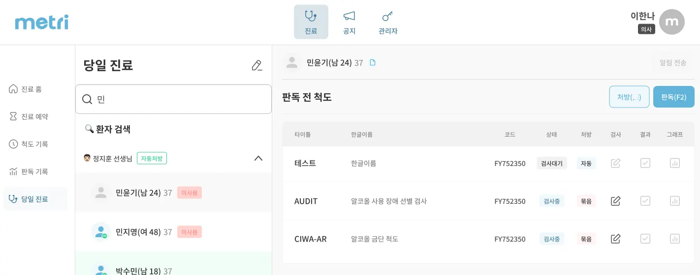 3) 처방된 척도는 환자에게 즉시 전달됩니다. 병원은 환자의 척도 검사 상태를 실시간으로 확인할 수 있습니다.