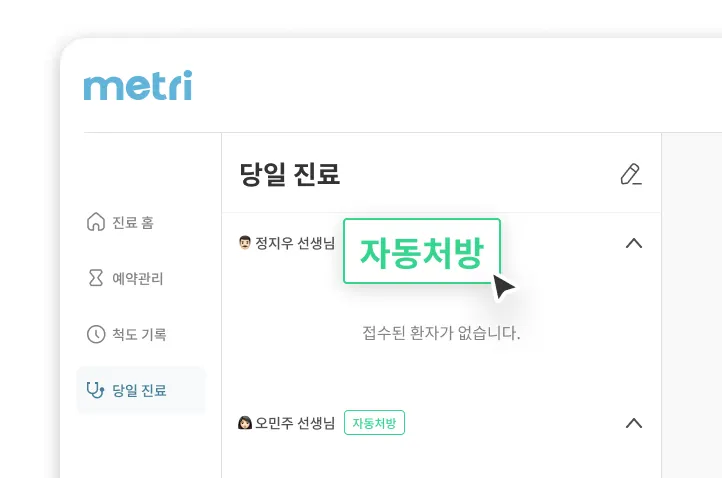 1) [진료] - [당일 진료] 메뉴를 선택 후, 좌측에 나열된 본인 이름 옆에 있는 “자동처방" 버튼을 클릭 해주세요.