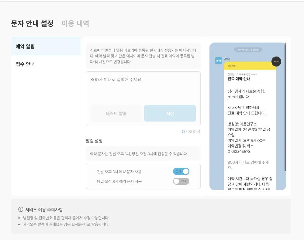 의원은 환자에게 전송되는 예약 알림 및 척도 처방 안내에 대한 내용을 설정할 수 있습니다.