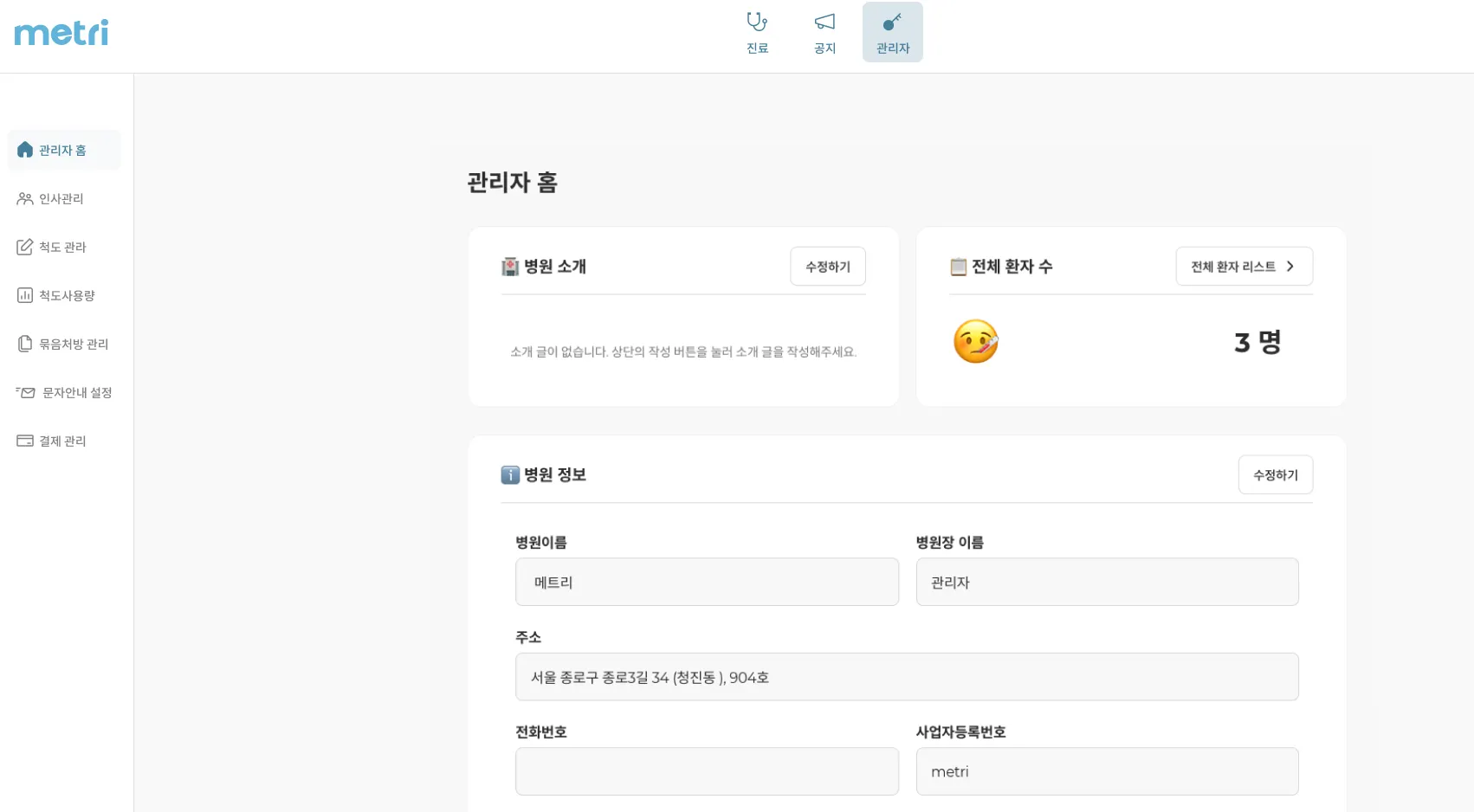 3) 병원명 및 전화번호 등은 [관리자] - [관리자 홈]의 ‘병원 정보’ 부분에서 수정 가능합니다.