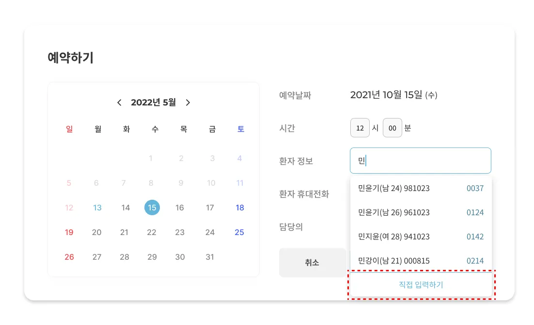 환자 정보를 직접 입력하여 예약을 생성하는 경우,