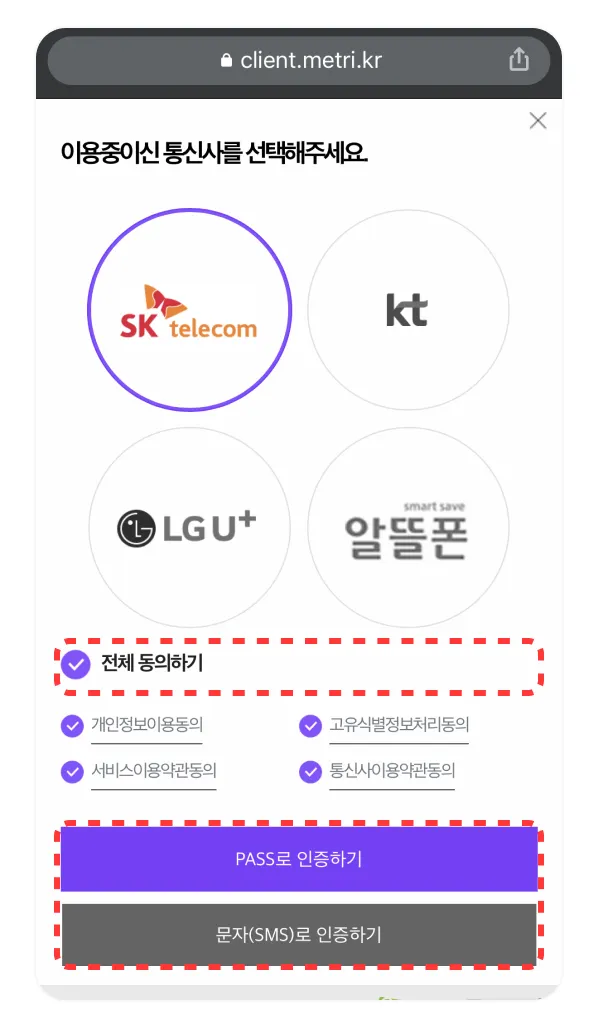 하단의 이미지가 나오면 현재 사용중인 통신사를 선택하신 후, ‘전체 동의하기’ 체크 후