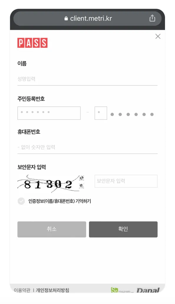 4) 개인정보 및 보안문자 입력 후 ‘확인’ 버튼을 클릭합니다.