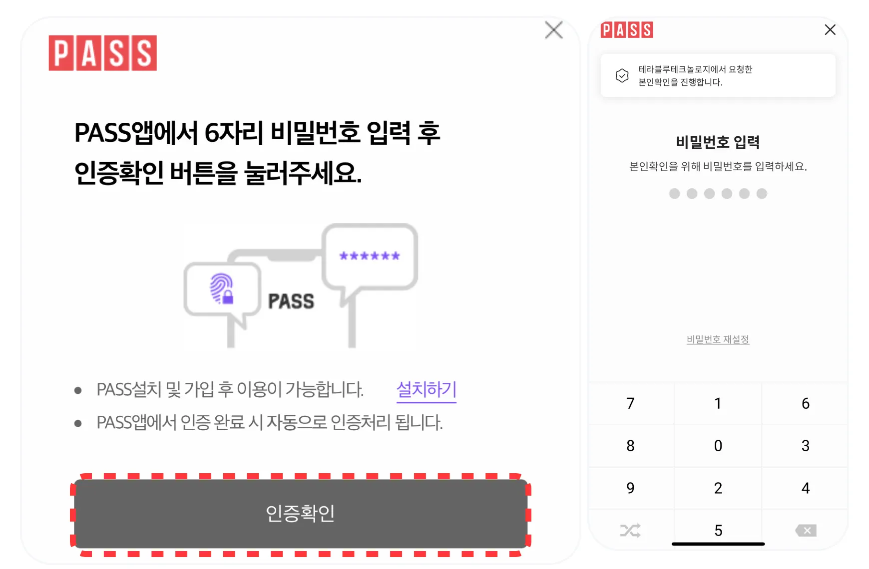 PASS앱에서 비밀번호 입력 후 브라우저로 돌아와 “인증확인"버튼을 클릭하면 회원가입이 완료됩니다.