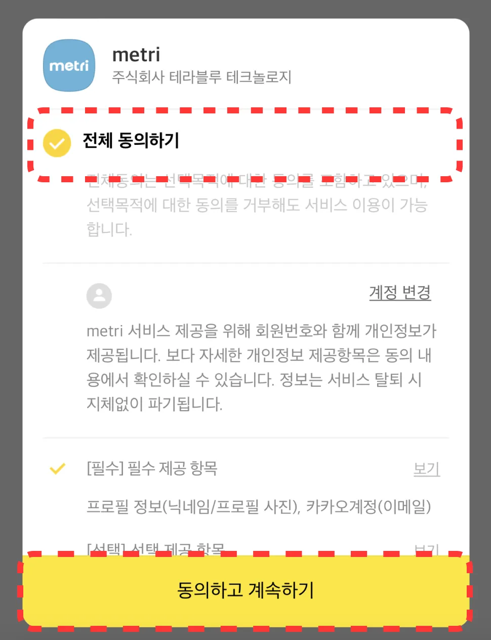 하단의 이미지와 같은 화면이 나오면 ‘전체 동의하기’를 체크하신 후, ‘동의하고 계속하기’ 버튼을 눌러주세요.