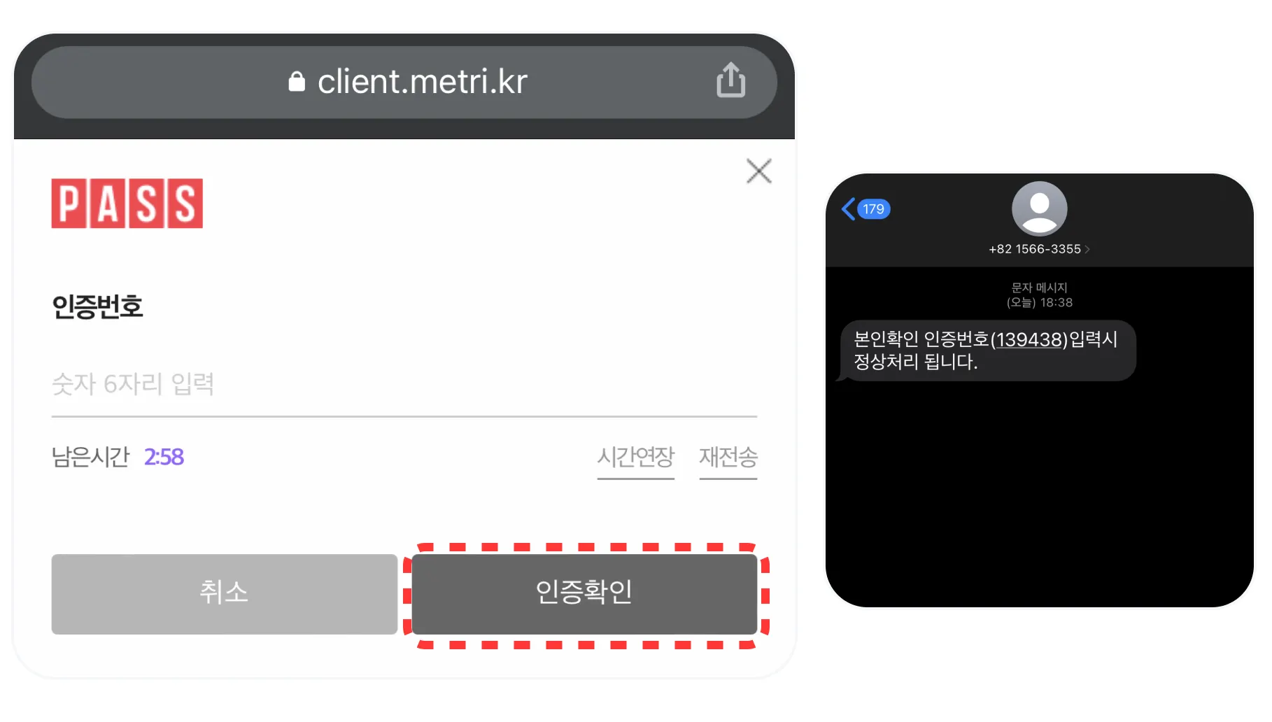 (a)PASS로 인증하기 , 혹은 (b)문자(SMS)로 인증하기 를 눌러주세요.