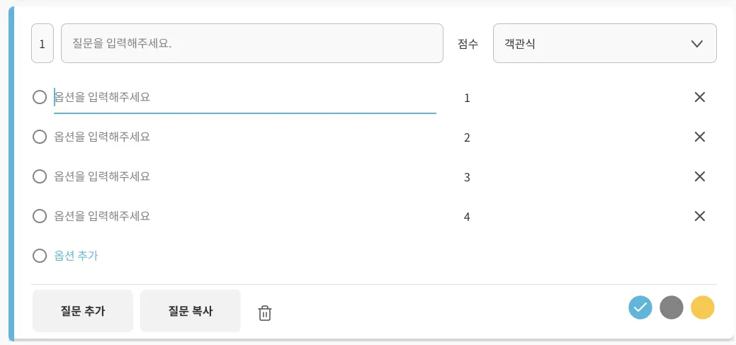 3) 질문은 객관식, 주관식 그리고 설명 세 가지 형태를 제공하며 입력하신 내용은 실시간으로 자동 저장됩니다.