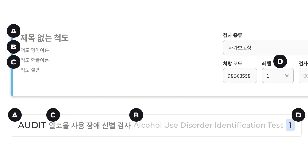 2) 척도 생성시 기재한 내용은 하단의 이미지처럼 척도 검색 시 각각 A, B, C, D로 매칭되어 노출됩니다.