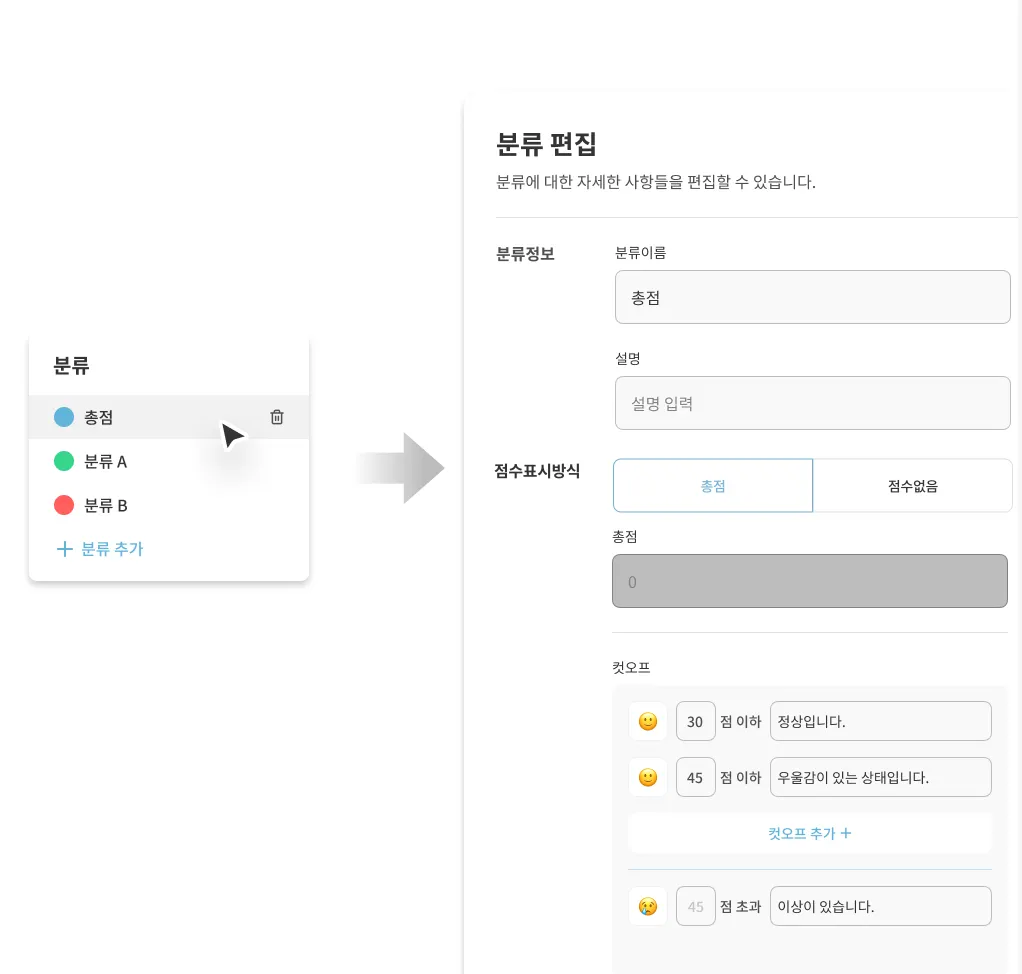4) 척도 정보 입력 란 우측에 있는 분류명을 클릭하여 분류 편집이 가능합니다. 점수표시방식에서 컷오프를 입력하면, 환자에게 총점에 따라 검사 결과를 다르게 표시하도록 설정할 수 있습니다.