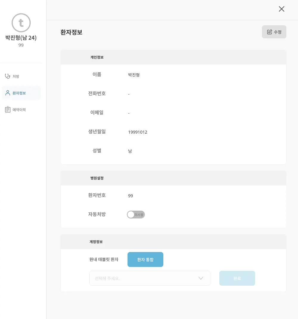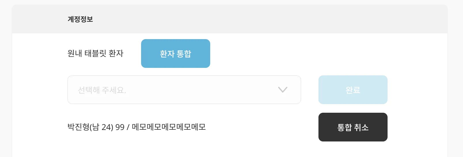 2) 하단 ‘계정정보’ 영역에서 ‘환자 통합’ 버튼을 눌러주세요. 해당 환자와 ‘이름, 성별, 생년월일’이 동일한 원내 환자의 목록이 보입니다. 동일인물에 대한 계정을 2개 이상 생성한 경우, 해당 기능을 이용하시어 편리하게 진료정보를 통합하시길 바랍니다.