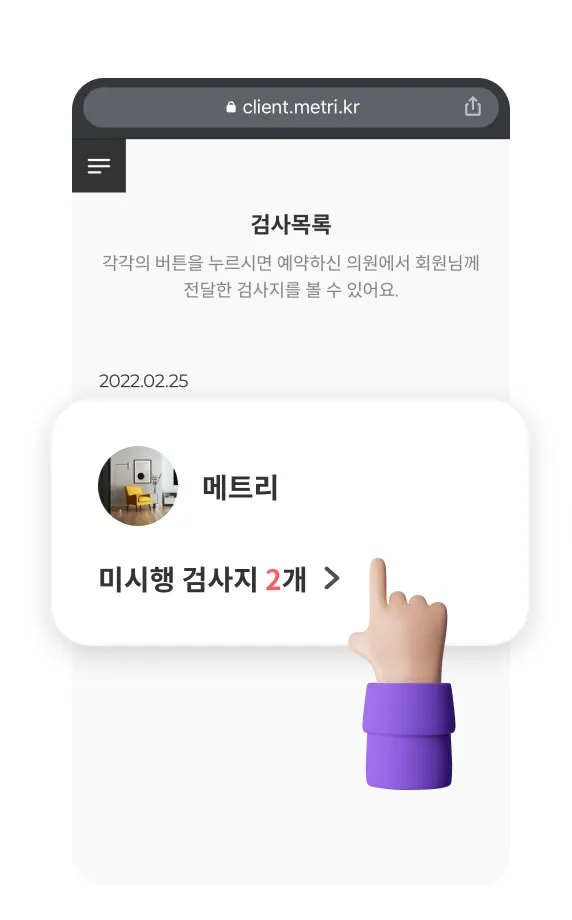 병원에서 처방한 검사지가 실시간으로 검사 목록에 노출됩니다.