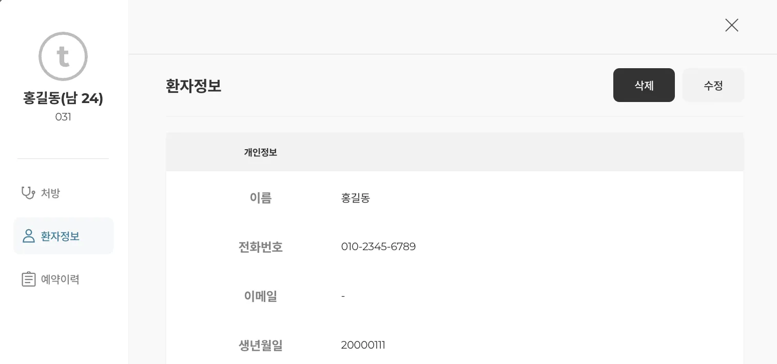 2) 환자정보 메뉴 상단에 ‘삭제’ 버튼을 눌러 환자를 삭제 혹은 미노출 처리하실 수 있습니다.